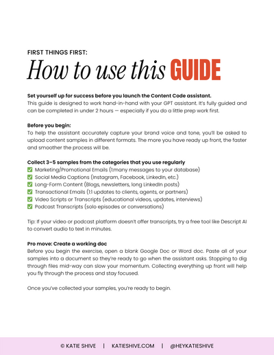 Your Brand Builder includes the entire Clarity Code framework plus two high-impact upgrades: a 30-day content strategy guide and two custom-built GPT assistants that help you write, post, and email with ease. Everything is designed to help you go from idea → execution without losing your voice or your time.